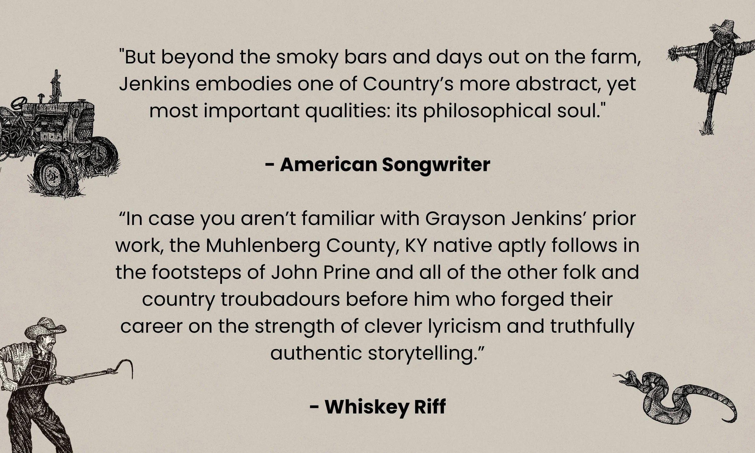 Born and raised in Muhlenberg County, KY (yes, the one from John Prine’s “Paradise”) on a small goat and horse farm in the heart of coal country, Grayson Jenkins is equal parts songwriter, storyteller, traveler and country music artist. At his core, Jenkins is a curious truth-seeker, observing and writing about his own choices and circumstances; along with those of family, friends and strangers. He finds inspiration in his travels, conversations at the grocery store, traumatic events, and really anything that life sheds an interesting light on. Jenkins' songs have gained the admiration of a loyal following, and fellow songwriters like Pony Bradshaw, Vincent Neil Emerson, and Nicholas Jamerson - all of whom have brought Jenkins on the road with them in the past two years.